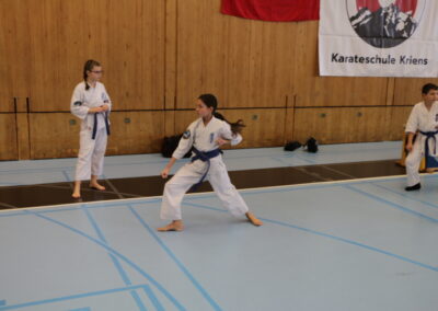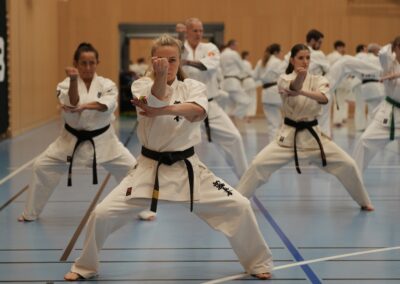 Nach 13.30 Uhr gab es eine Performance- und Mindset-Lektion. Hier erlernten die Karatekas, was alles zu einer Kata gehört und worauf bei einer Präsentation geachtet werden muss. Nach dem im Preis inbegriffenen Mittagessen ging es weiter mit kraftvollen Drehungen und dem Training explosiver Kicks. Bei weiteren Kata-Übungen konnten die Teilnehmer das Gelernte anwenden.