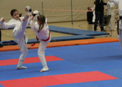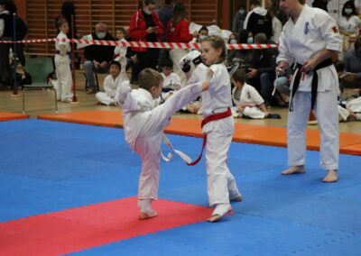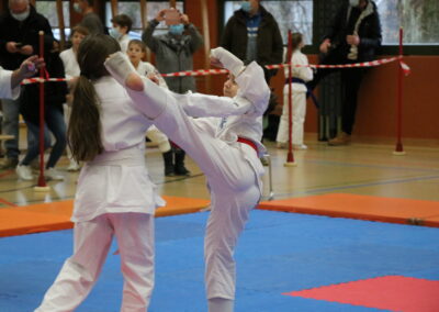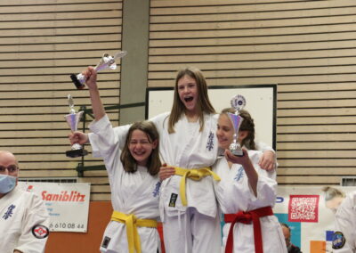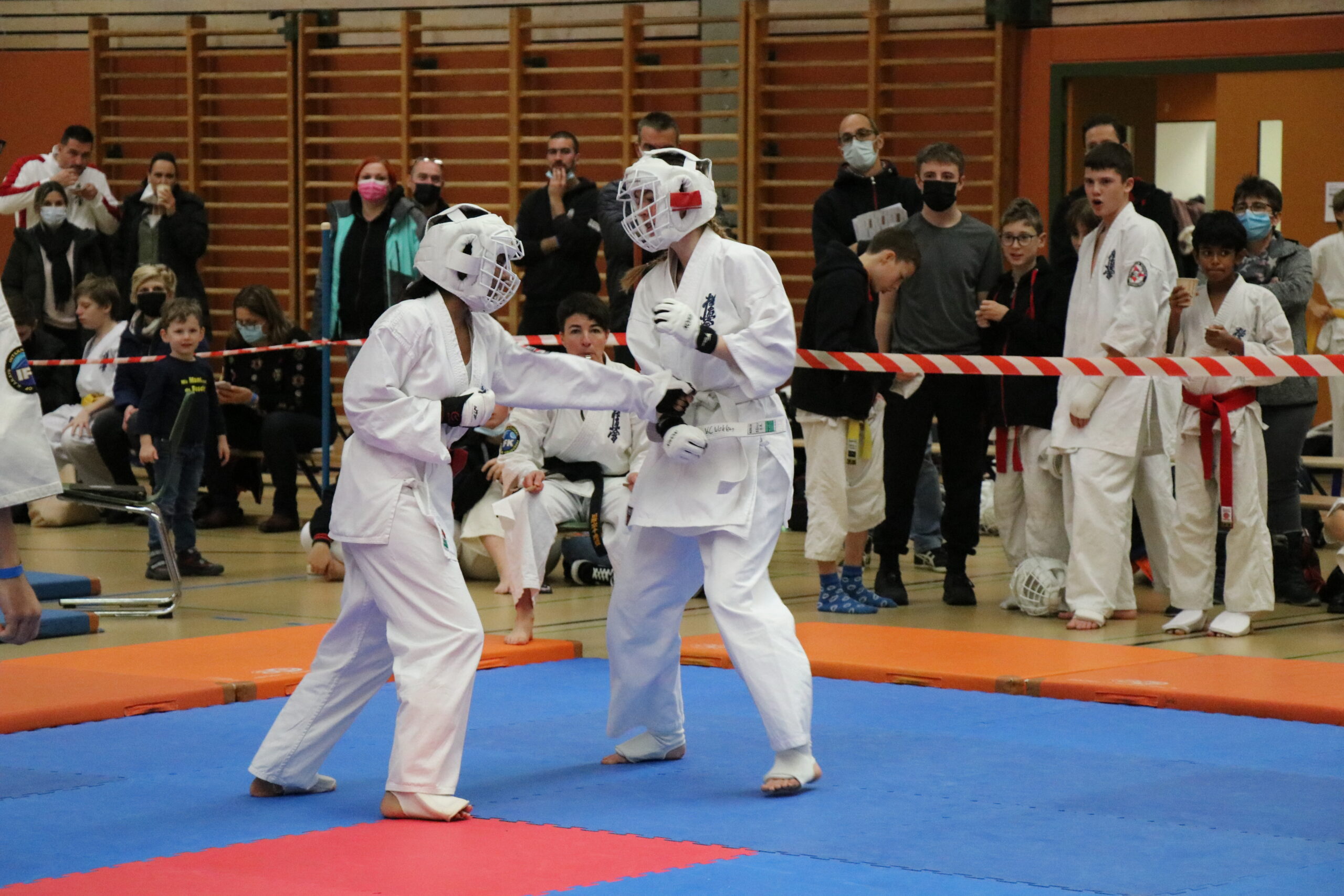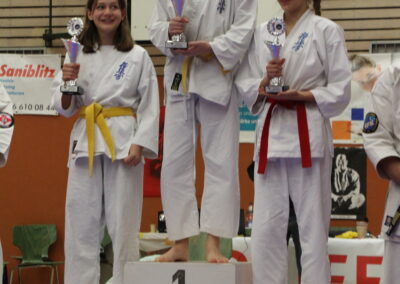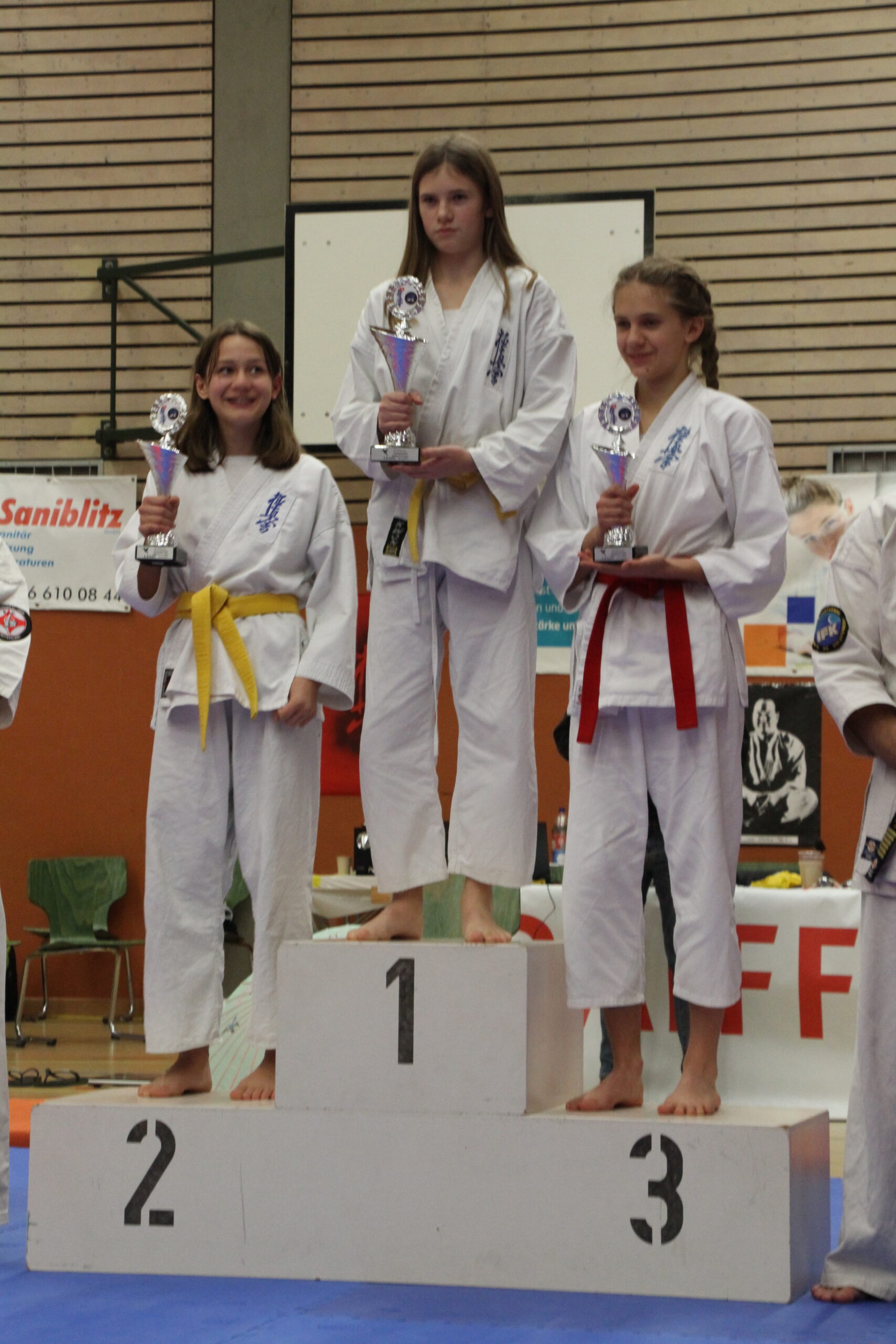 Bei den Mädchen im Alter von 12 und 13 Jahren war mit Lara Geissmann ebenfalls eine Teilnehmerin aus den Reihen des Gastgeber-Dojos vertreten. Sie musste sich mit zwei deutlich erfahreneren Kämpferinnen messen. Obwohl sie schon im ersten Kampf einen harten Wirkungstreffer einstecken musste, biss sie bis zum Schluss durch und holte sich den 3. Rang.