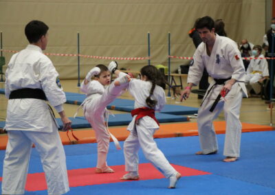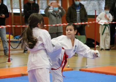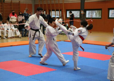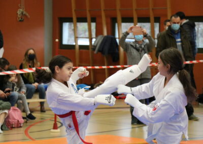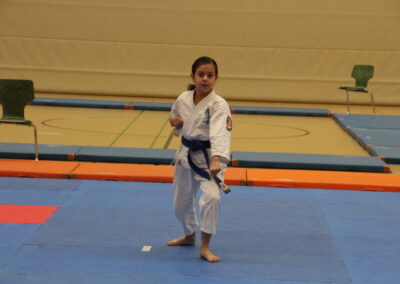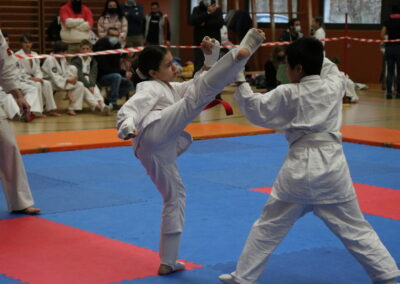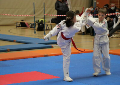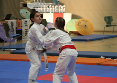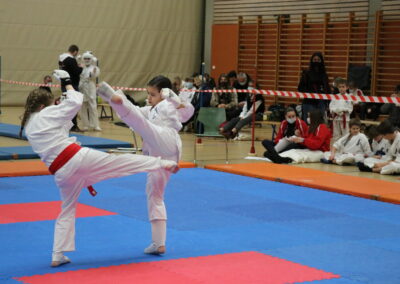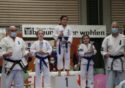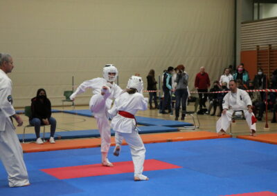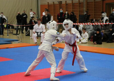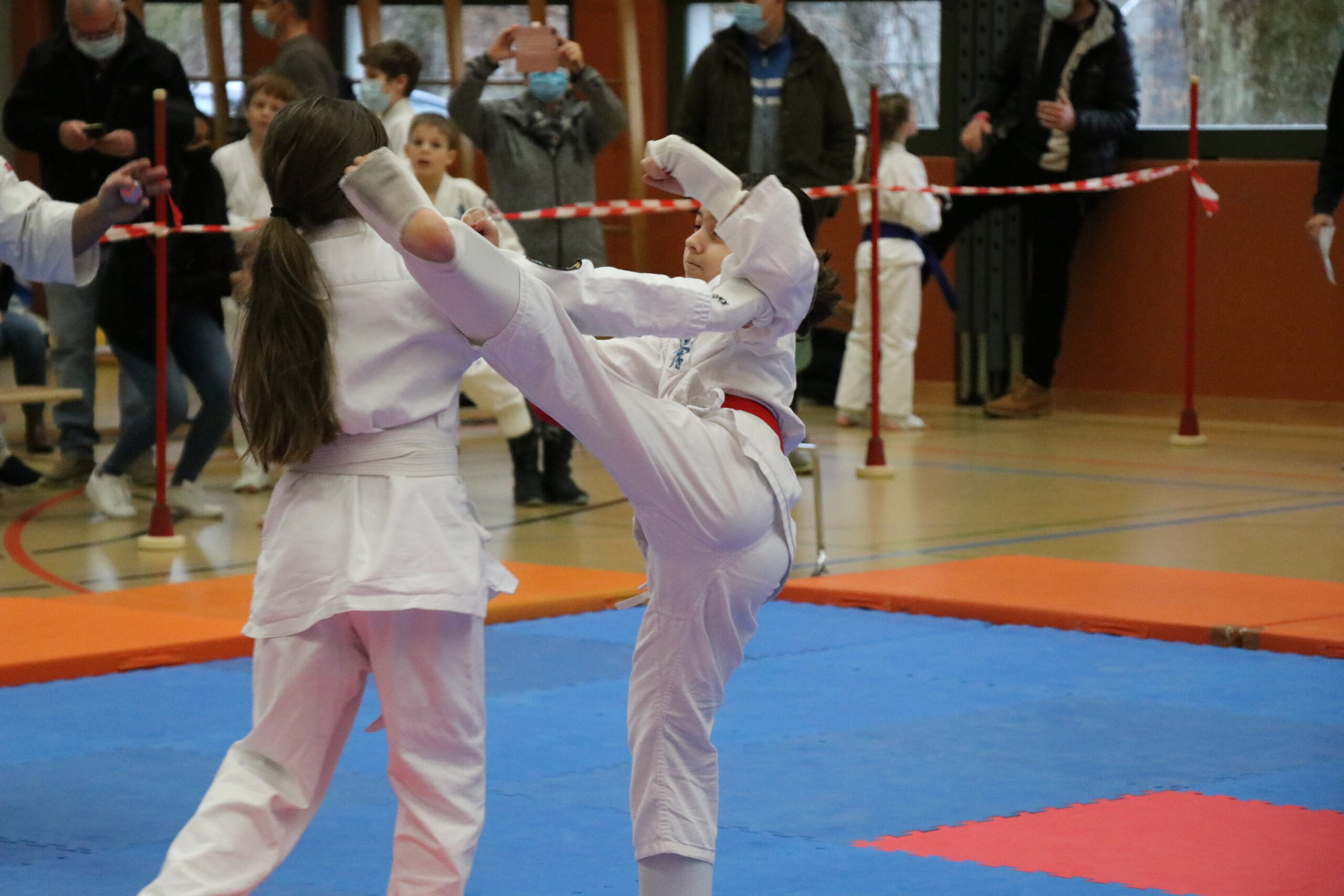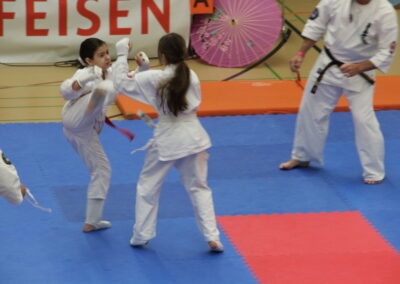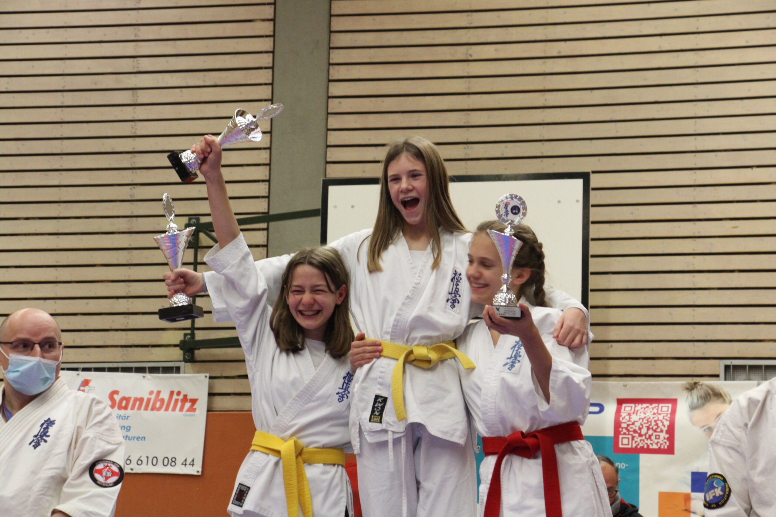 Bei den Mädchen im Alter von 12 und 13 Jahren war mit Lara Geissmann ebenfalls eine Teilnehmerin aus den Reihen des Gastgeber-Dojos vertreten. Sie musste sich mit zwei deutlich erfahreneren Kämpferinnen messen. Obwohl sie schon im ersten Kampf einen harten Wirkungstreffer einstecken musste, biss sie bis zum Schluss durch und holte sich den 3. Rang.